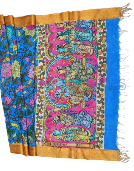 Blue hand painted pen kalamkari Chanderi Silk Cotton Dupatta