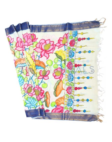 Off-white and blue hand painted pen kalamakari Chanderi Silk cotton Duppatta