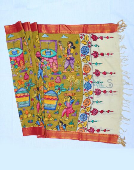 Light brown hand painted pen kalamakari Chanderi Silk cotton Duppatta