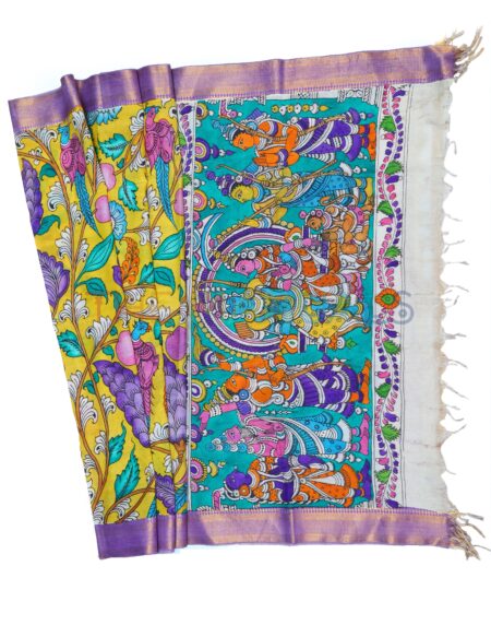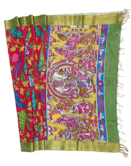 The light brown Kalamkari dupatta is a seamless blend of tradition and contemporary elegance. Crafted from Chanderi silk cotton, the fabric is soft and timeless, each hand-painted stroke telling a unique story that brings ancient designs to life.